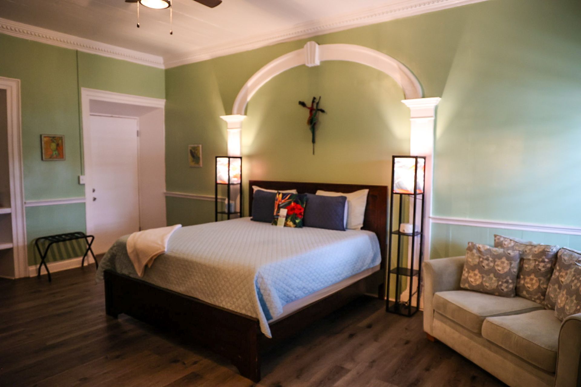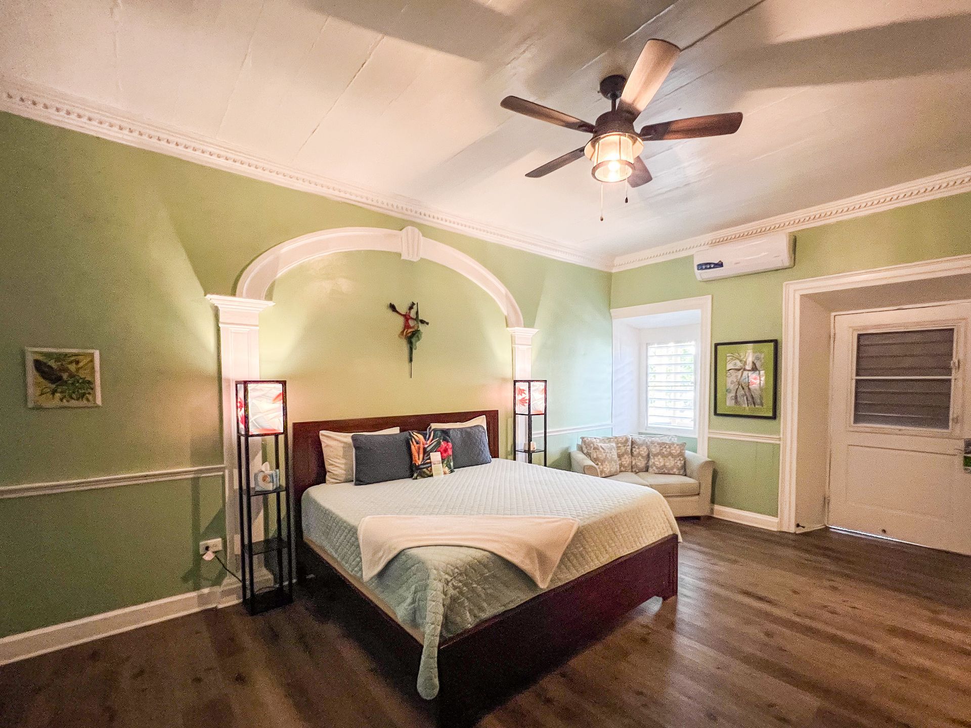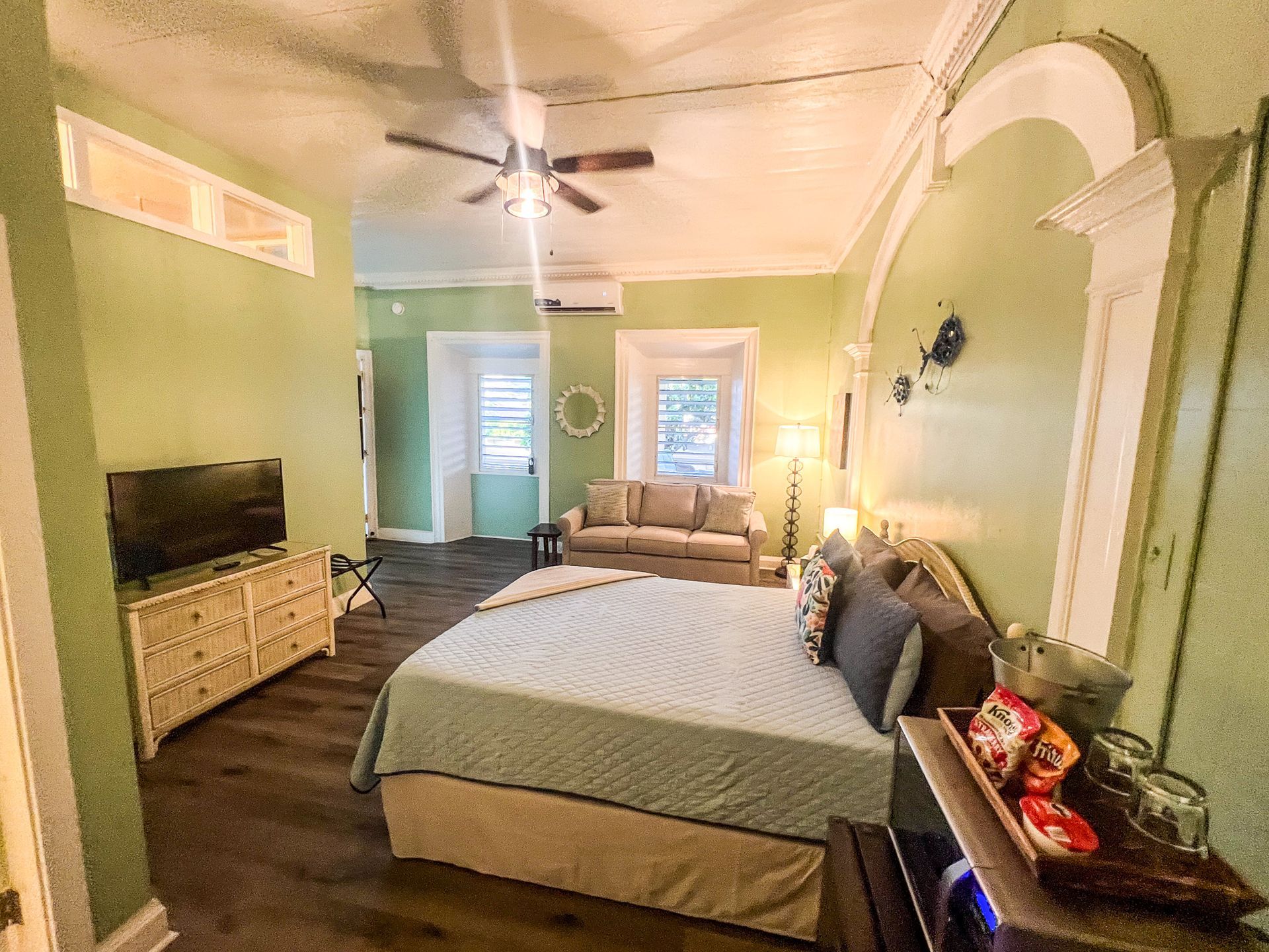 Chaney was built where the original carriage house existed on property. This first floor suite enters into a living area with a queen-sized sleeper sofa allowing for more sleeping options, high top table with chairs, and a stone mounted flat screen TV. The kitchenette boasts a full-sized fridge, toaster oven, microwave, and coffee maker. Walk from the living area/kitchenette thru the historic archway into separate bedroom with a private bathroom and large walk-in shower. AC's in both the living area and the bedroom. Wi-Fi included. Outside the unit is a tranquil area with a hammock, bistro style table and chairs. Sit in the shade under a palm tree while soaking up the Caribbean warmth. Steps away from our front gate, this is a very convenient option for anyone looking to stroll around town or walk 100 feet to the some of the best scuba & snorkeling on St.Croix!