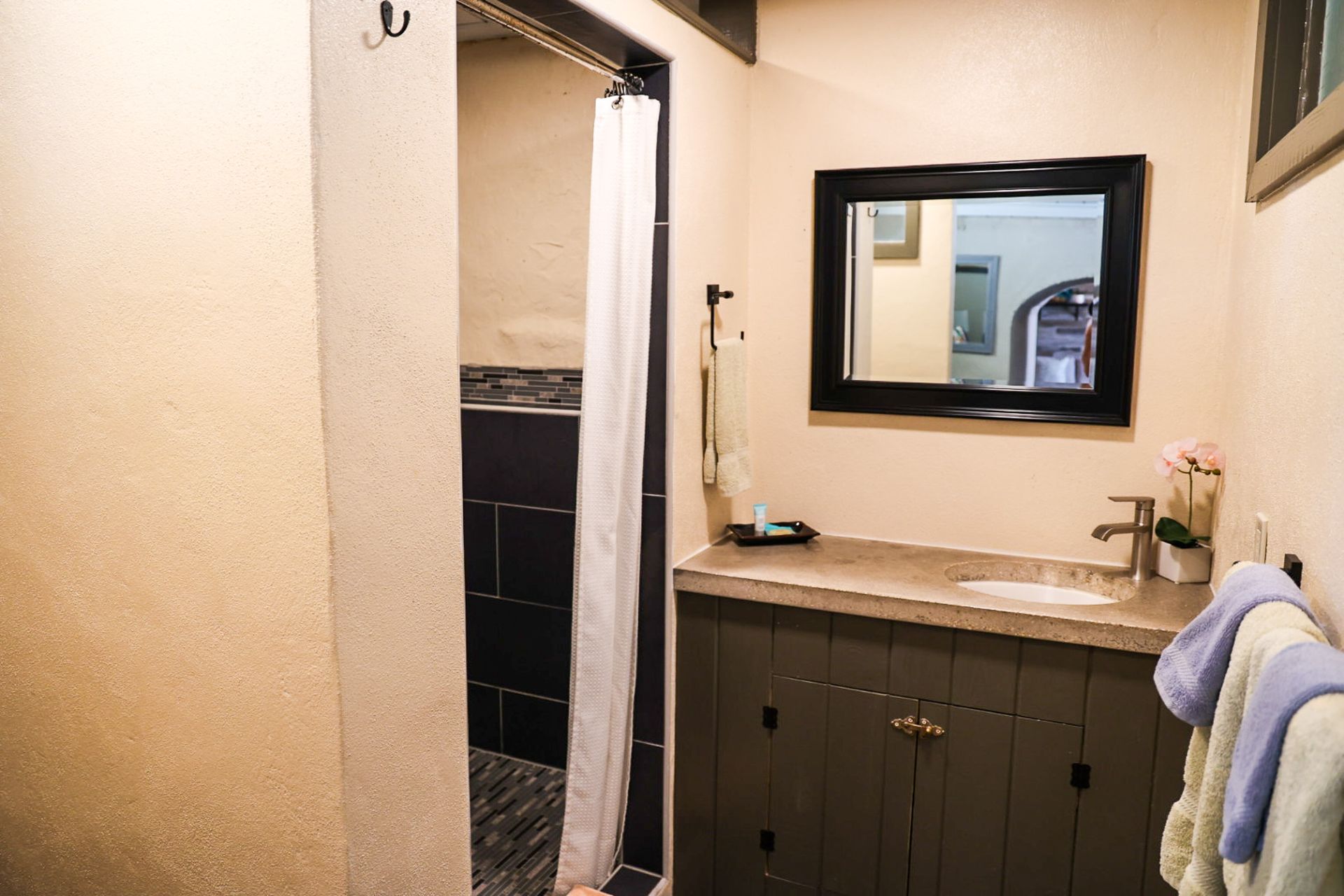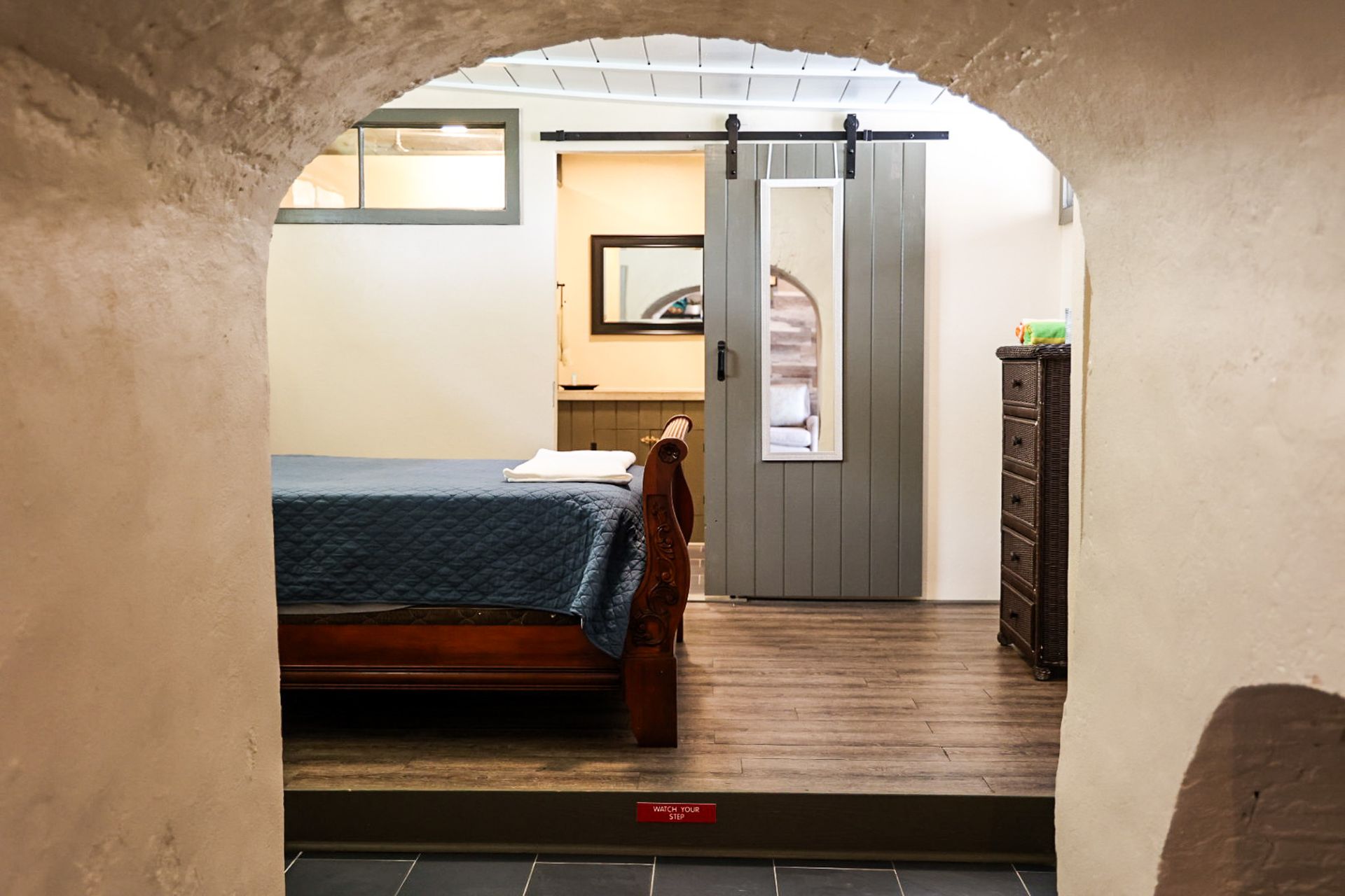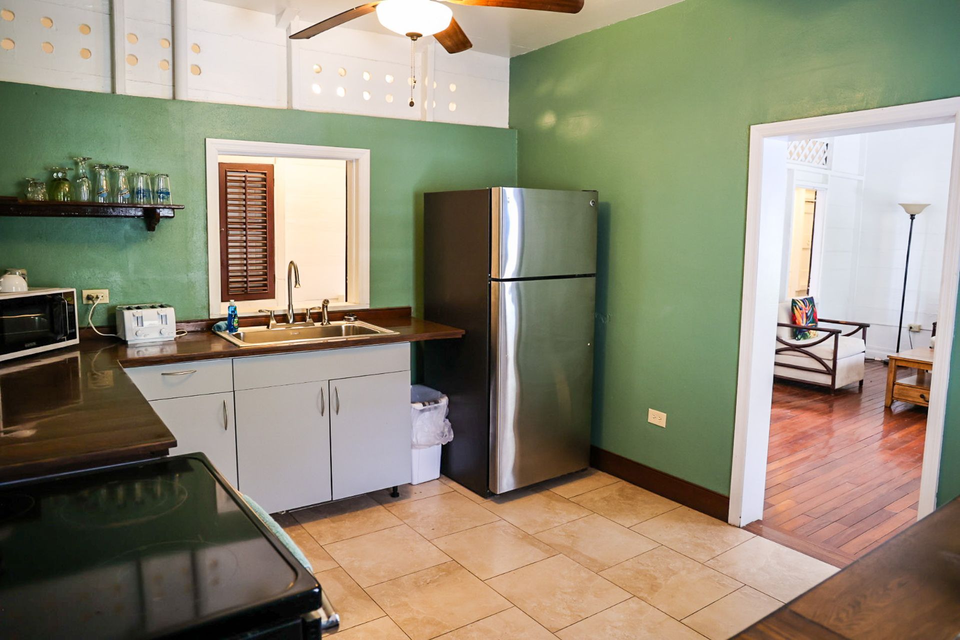 Chaney was built where the original carriage house existed on property. This first floor suite enters into a living area with a queen-sized sleeper sofa allowing for more sleeping options, high top table with chairs, and a stone mounted flat screen TV. The kitchenette boasts a full-sized fridge, toaster oven, microwave, and coffee maker. Walk from the living area/kitchenette thru the historic archway into separate bedroom with a private bathroom and large walk-in shower. AC's in both the living area and the bedroom. Wi-Fi included. Outside the unit is a tranquil area with a hammock, bistro style table and chairs. Sit in the shade under a palm tree while soaking up the Caribbean warmth. Steps away from our front gate, this is a very convenient option for anyone looking to stroll around town or walk 100 feet to the some of the best scuba & snorkeling on St.Croix!