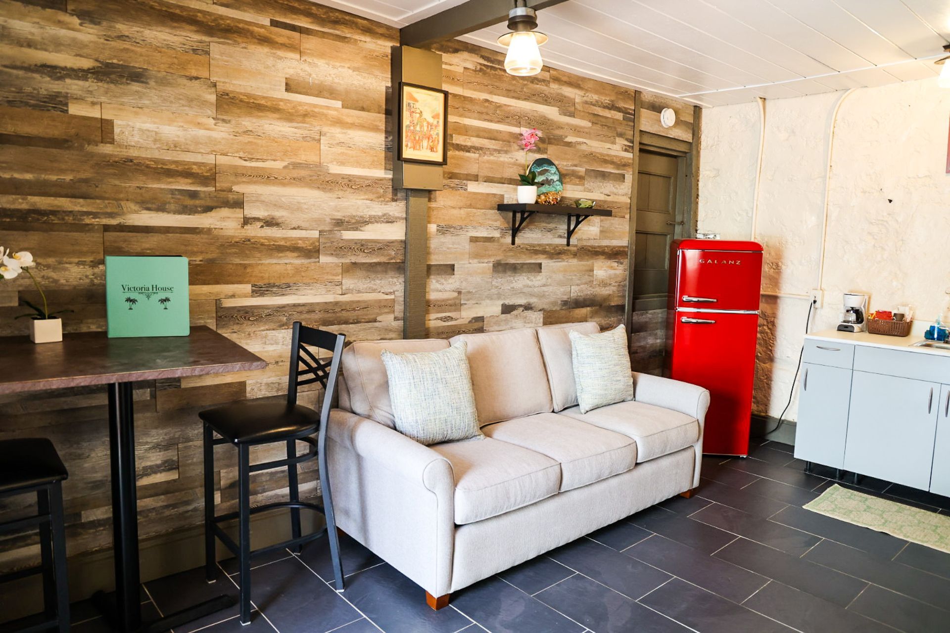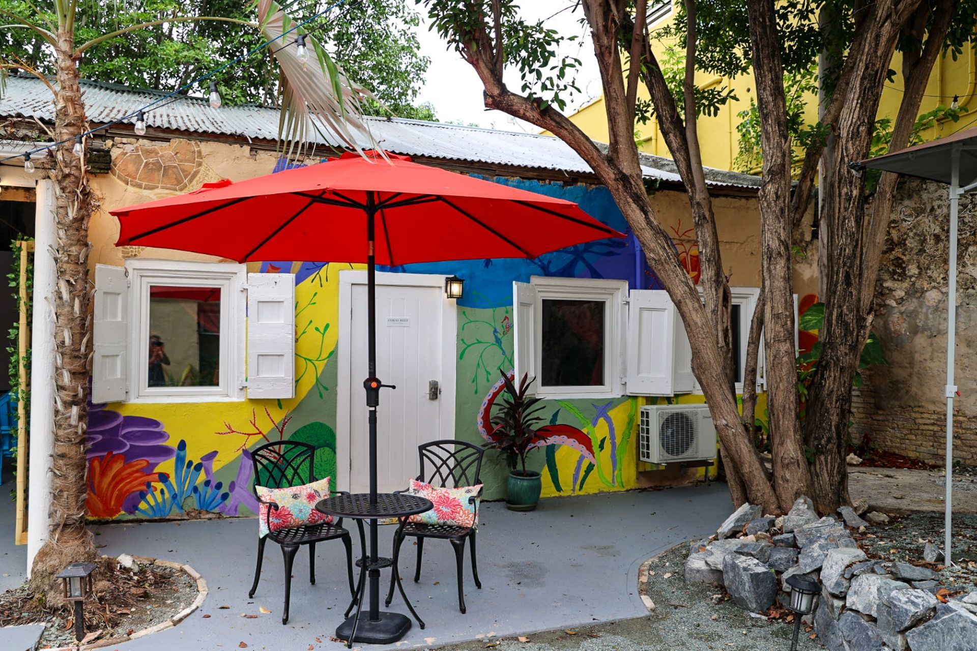 Our newest addition at Victoria House, The Coral Reef, is a ground floor room built in historic stables. With Coral stone walls exposed, you can appreciate the engineering of the past while enjoying the comforts of a modernized space. This studio comes with a queen sized bed, pull out sleeper sofa, flat screen smart TV, bedside USB ports, AC, Wi-Fi, full sized fridge, microwave, toaster oven, kitchen utensils, and an outdoor patio and bistro table to enjoy your morning coffee. We’ve added ambient lighting so you can feel like you’re swimming in the Caribbean sea even while you’re relaxing inside!