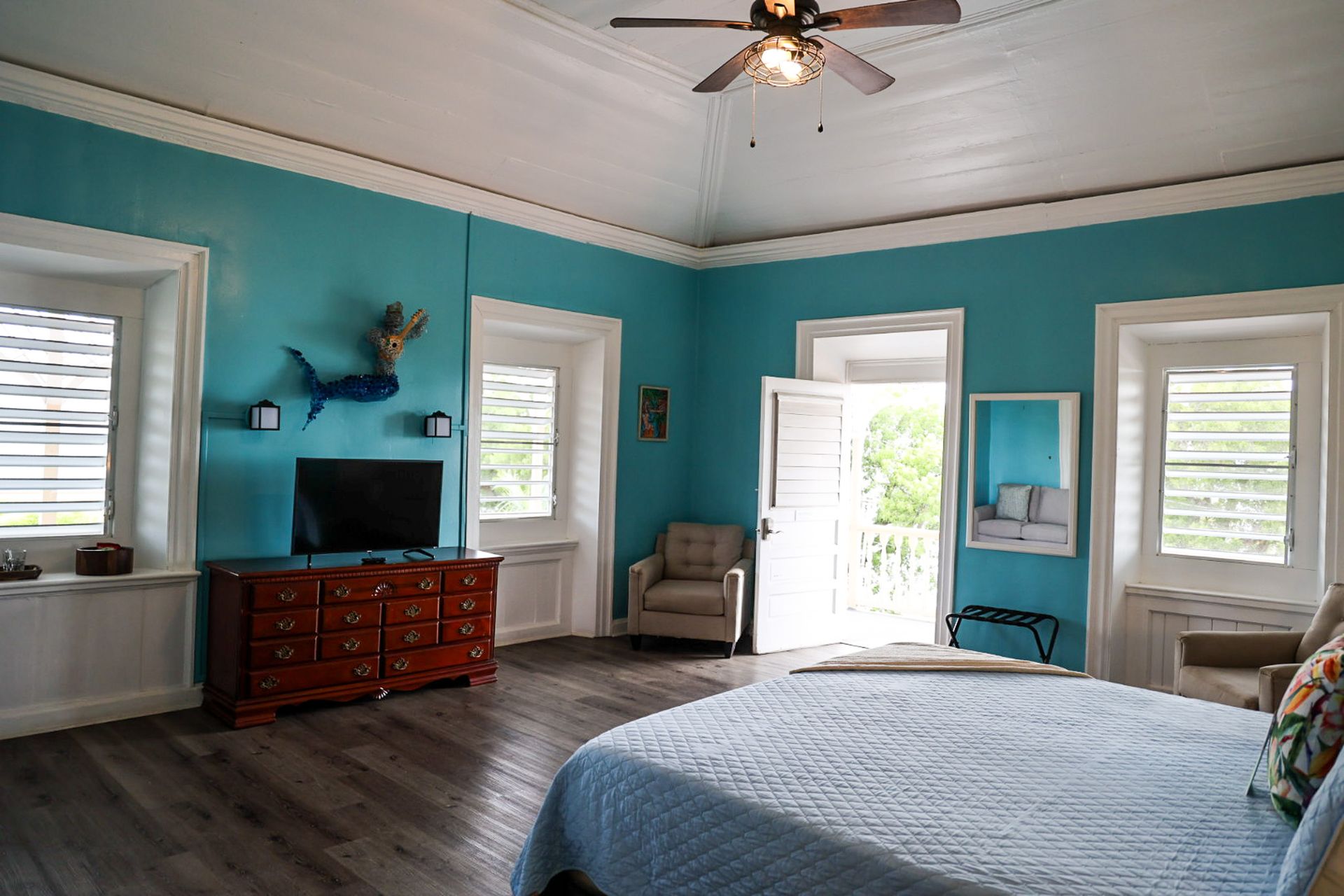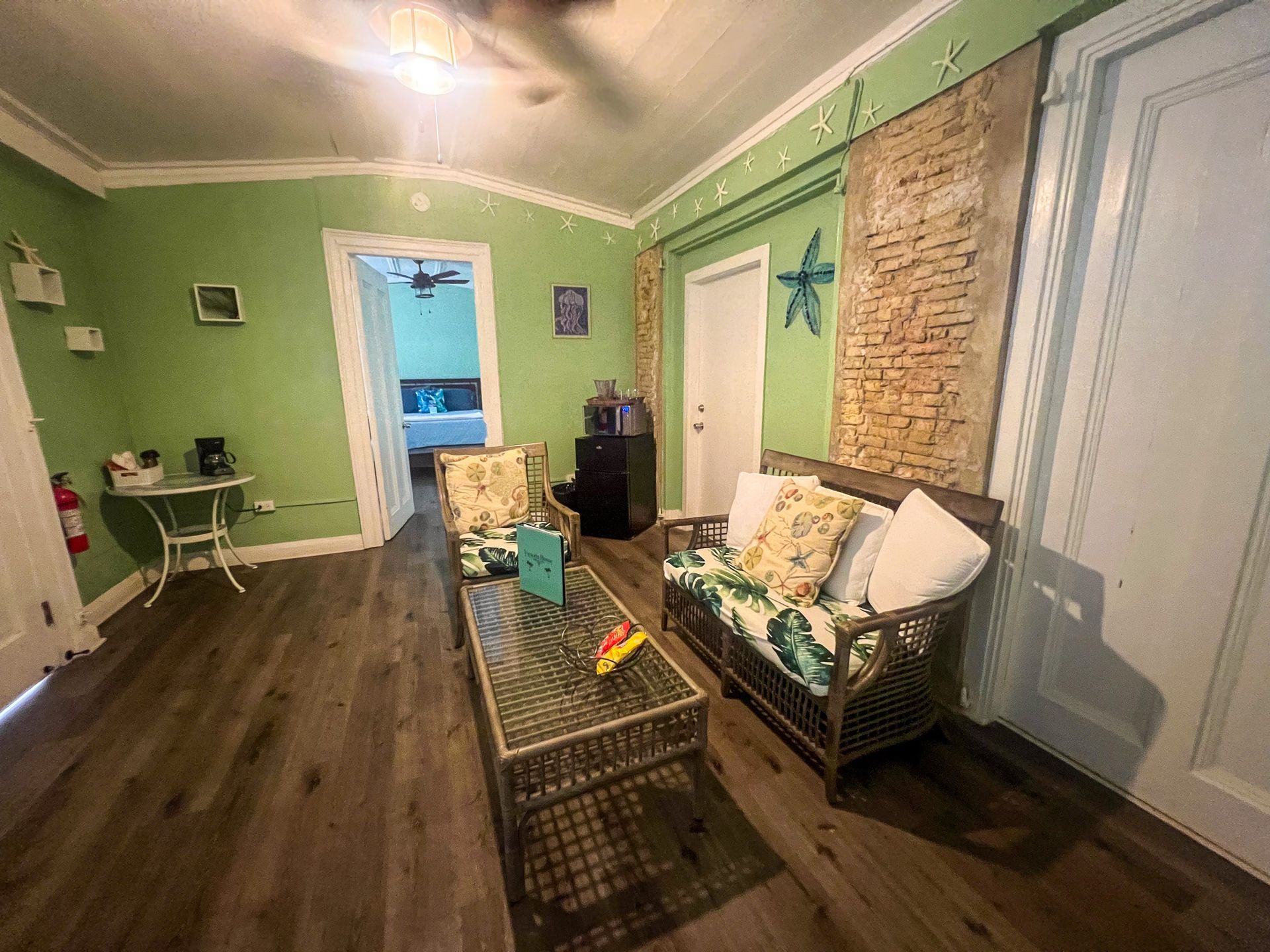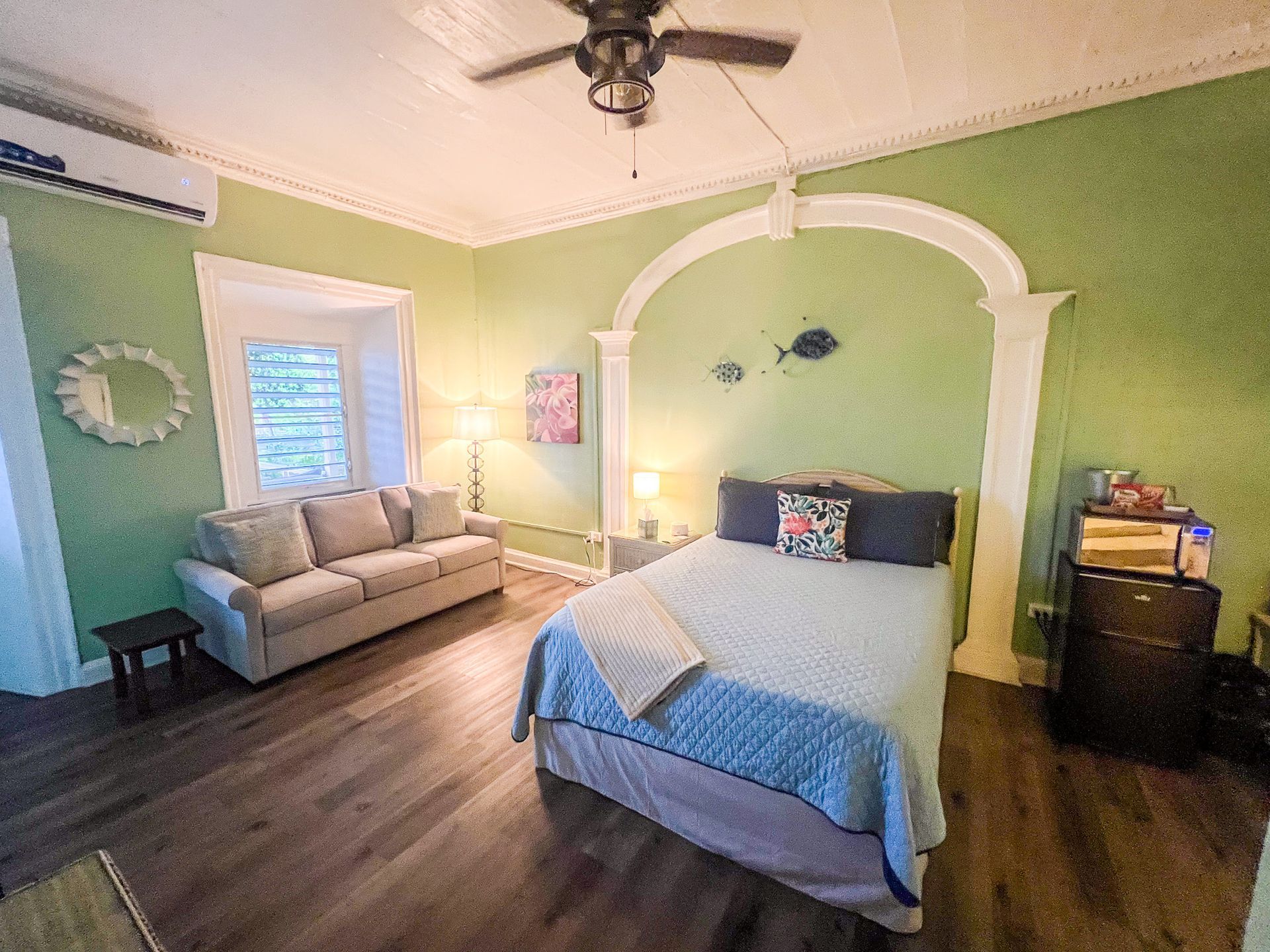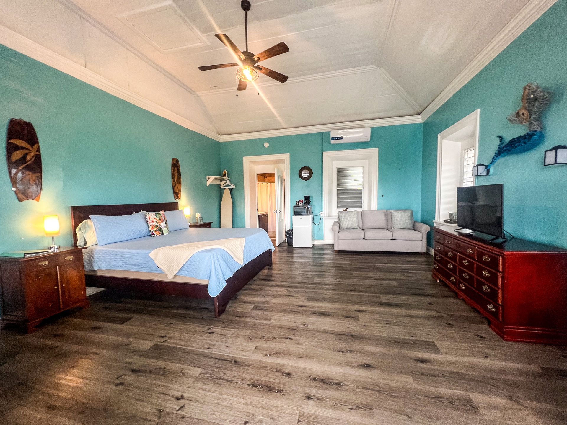 This 2nd floor studio style room has a Queen-sized bed, microwave, minifridge, coffee maker, TV, Wi-Fi, AC, and a private bathroom with large walk-in shower. A queen- sized sleeper sofa adds more sleeping options to the room. The unit shares an outdoor seating area overlooking Victoria House’s beautiful garden/courtyard. One of Frederiksted's largest Avocado Trees grows right outside your room, feel free to grab one when in season! This room can also be adjoined with the Starfish to create a three-bedroom suite.