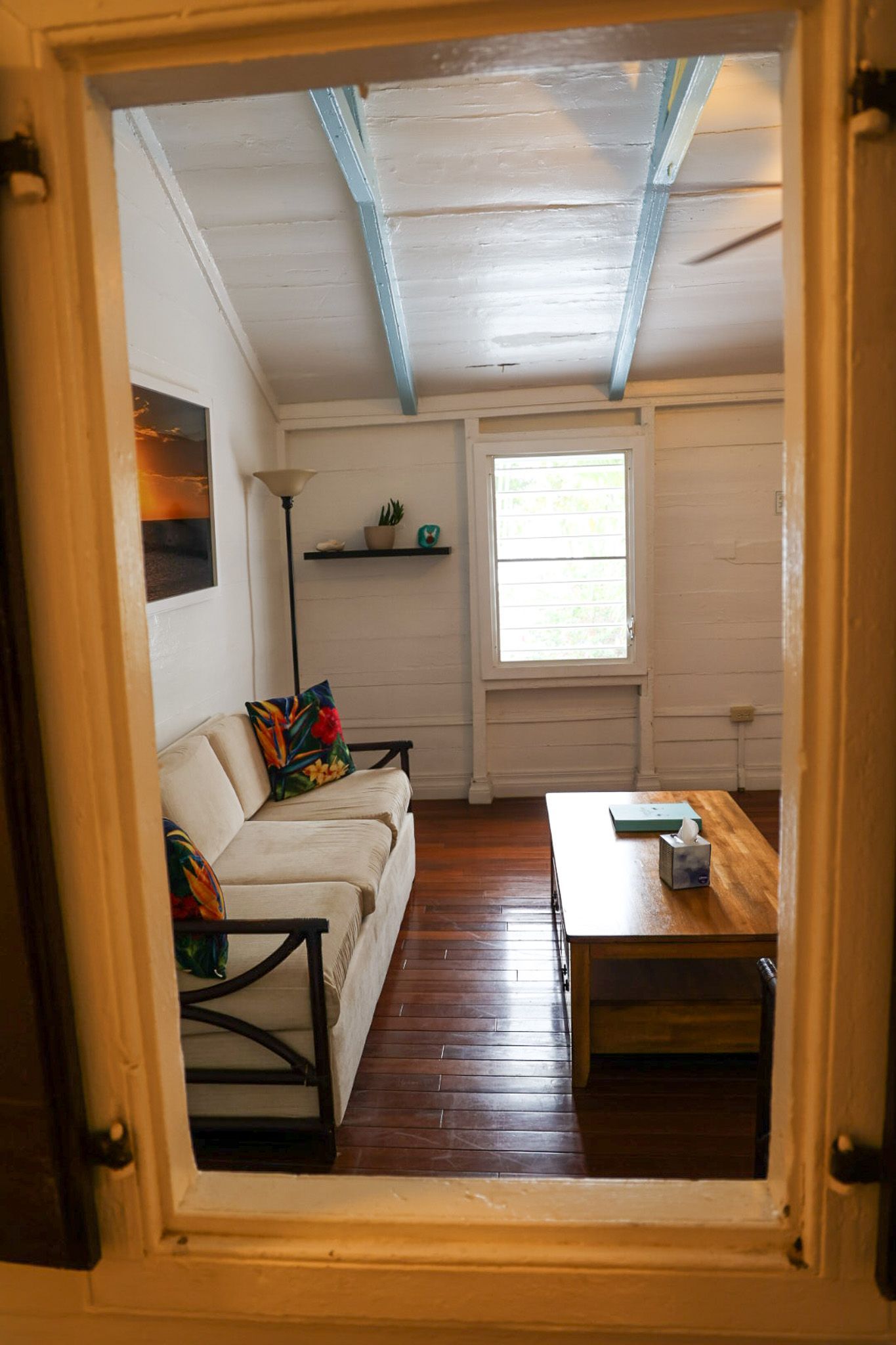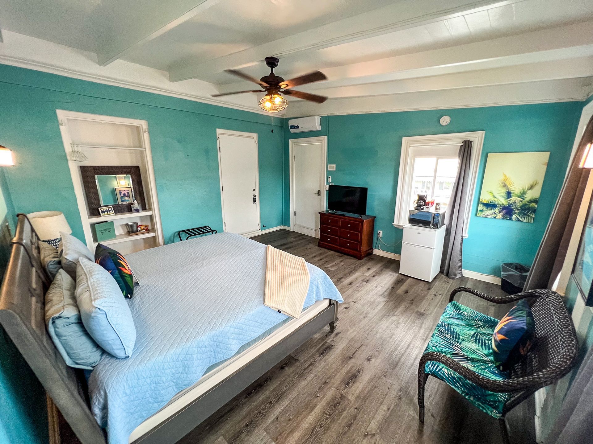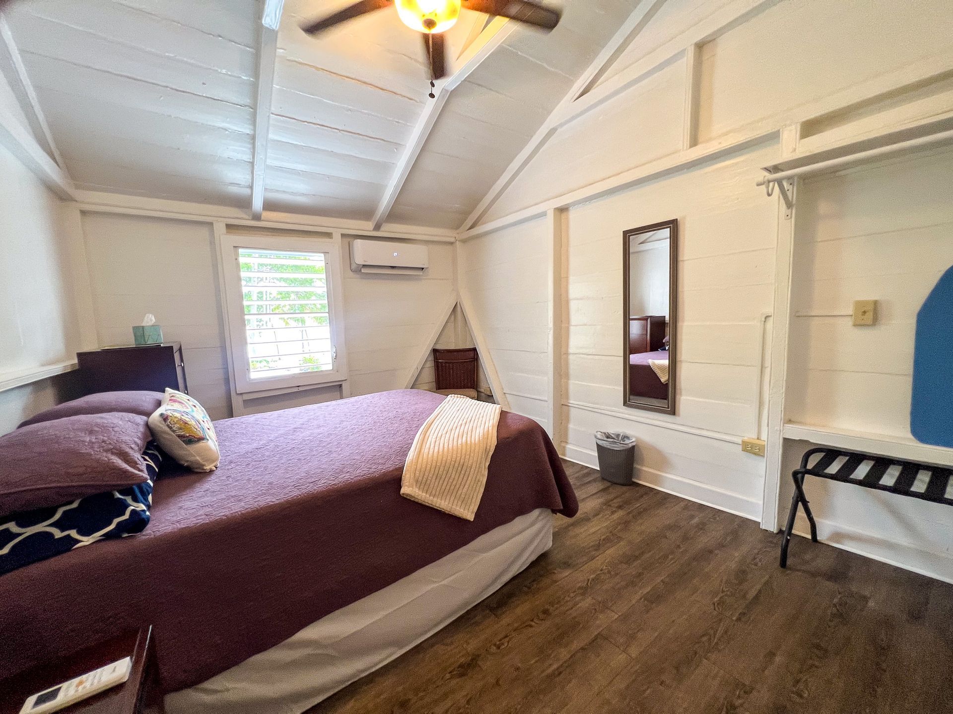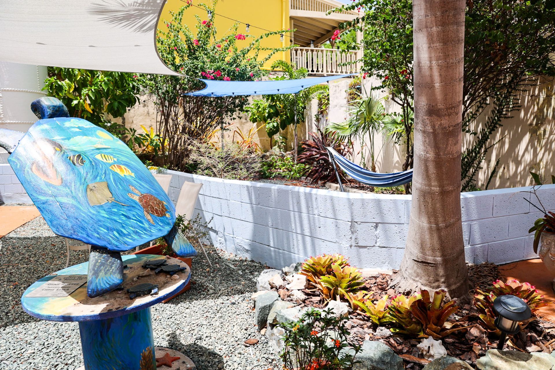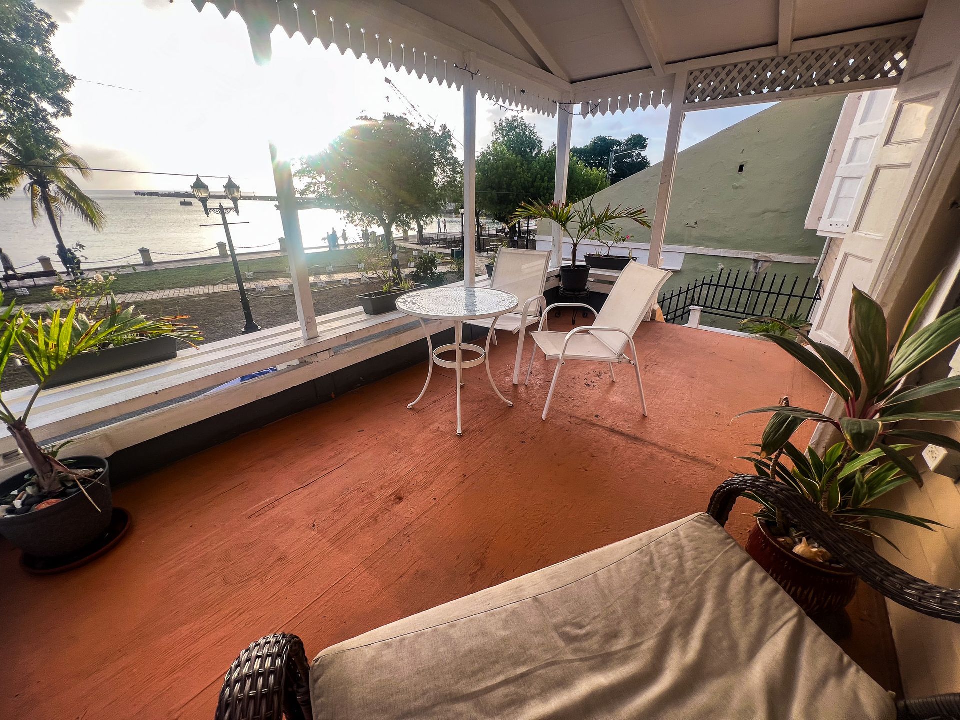 This 2nd floor studio style room has a Queen-sized bed, microwave, minifridge, coffee maker, TV, Wi-Fi, AC, and a private bathroom with large walk-in shower. A queen- sized sleeper sofa adds more sleeping options to the room. The unit shares an outdoor seating area overlooking Victoria House’s beautiful garden/courtyard. One of Frederiksted's largest Avocado Trees grows right outside your room, feel free to grab one when in season! This room can also be adjoined with the Starfish to create a three-bedroom suite.