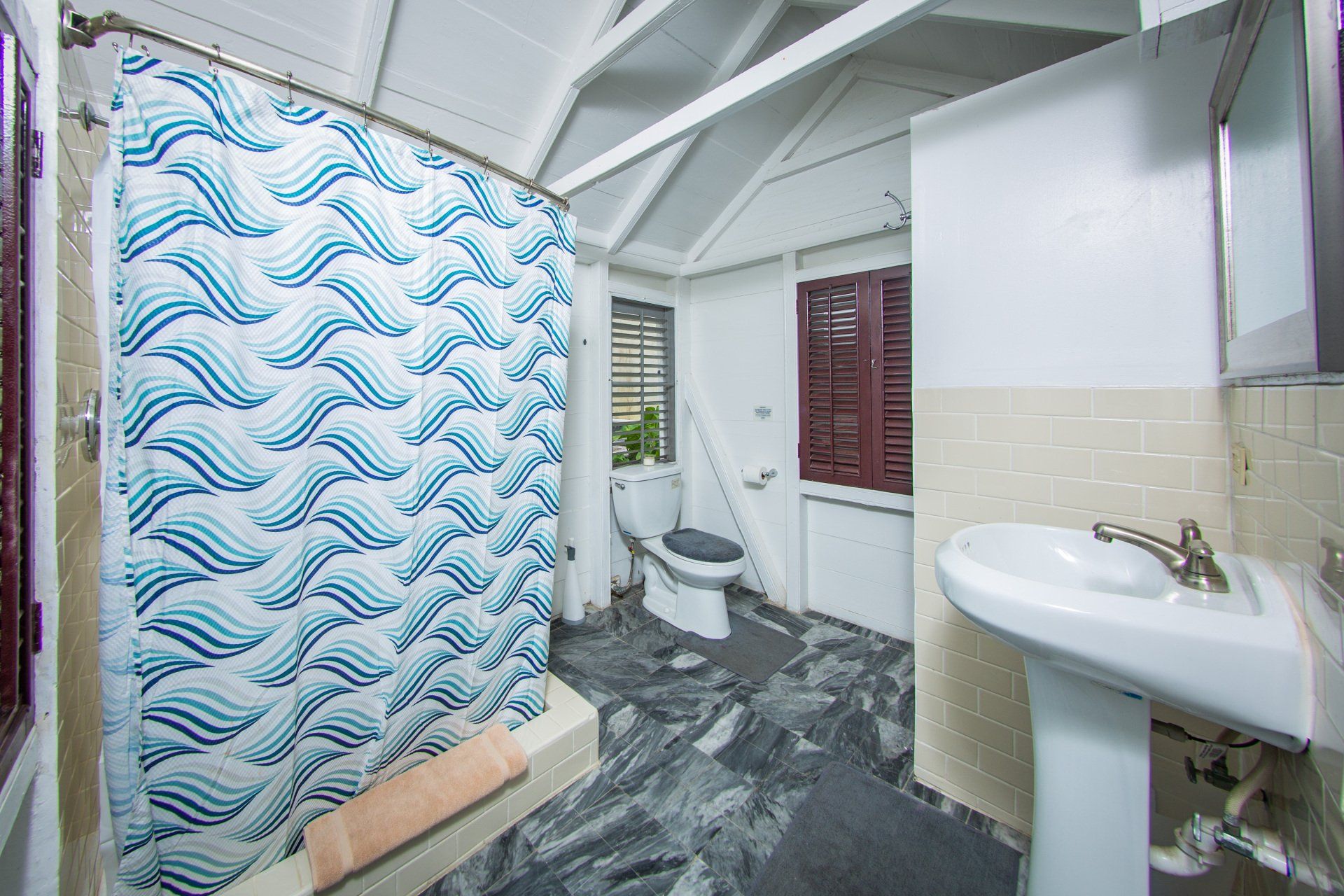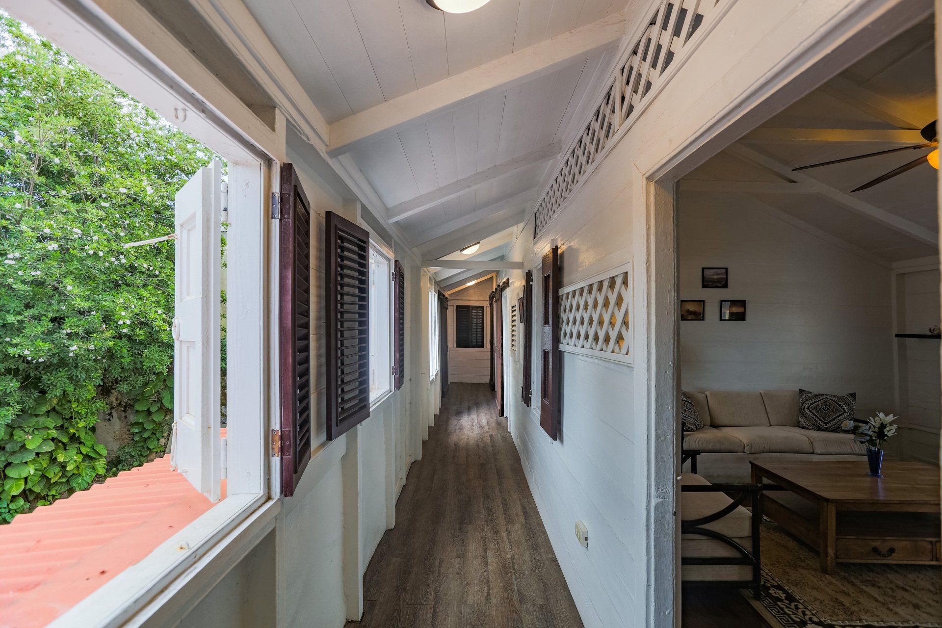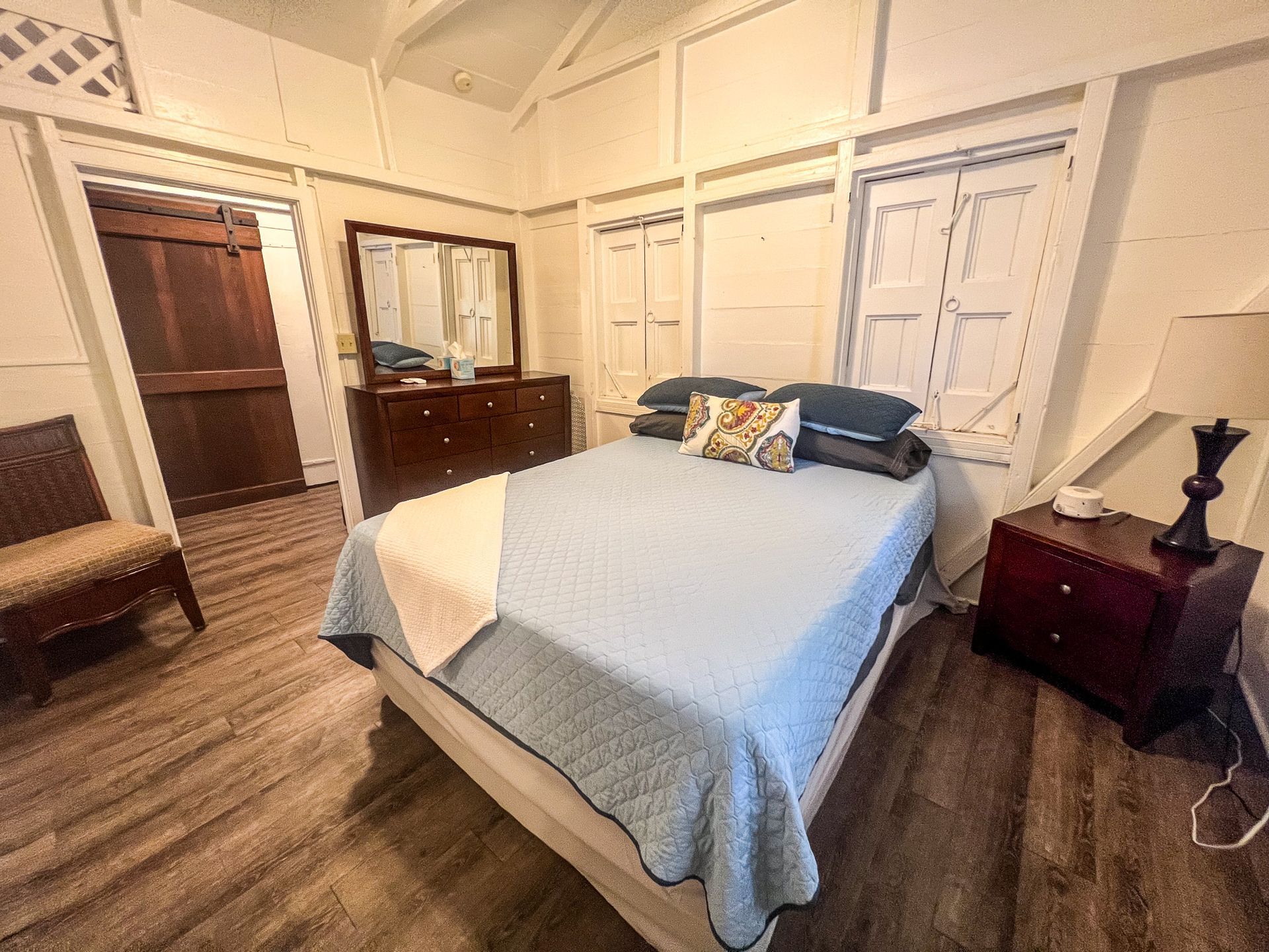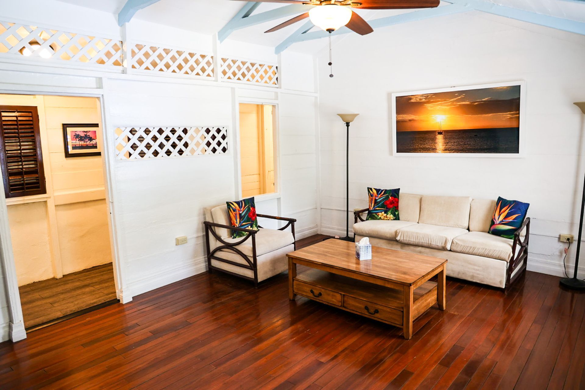 This two bedroom one bathroom suite is one of our largest. From the front door, imagine partial ocean views and great breezes cooling off your suite while taking in a beautiful sunset. This suite also boasts a full kitchen, with everything you will need to make a delicious meal for up to 4 people as well as a coffee maker for early risers. It also has a TV, WiFi, AC units in each bedroom, full sized couch, arm chair, ceiling fans, private bathroom with a walk-in shower, and traditional style dutch shutters. Steps away from our front gate, this is a very convenient option for anyone looking to stroll around town or have two couples enjoy a comfortable room in a prime location.