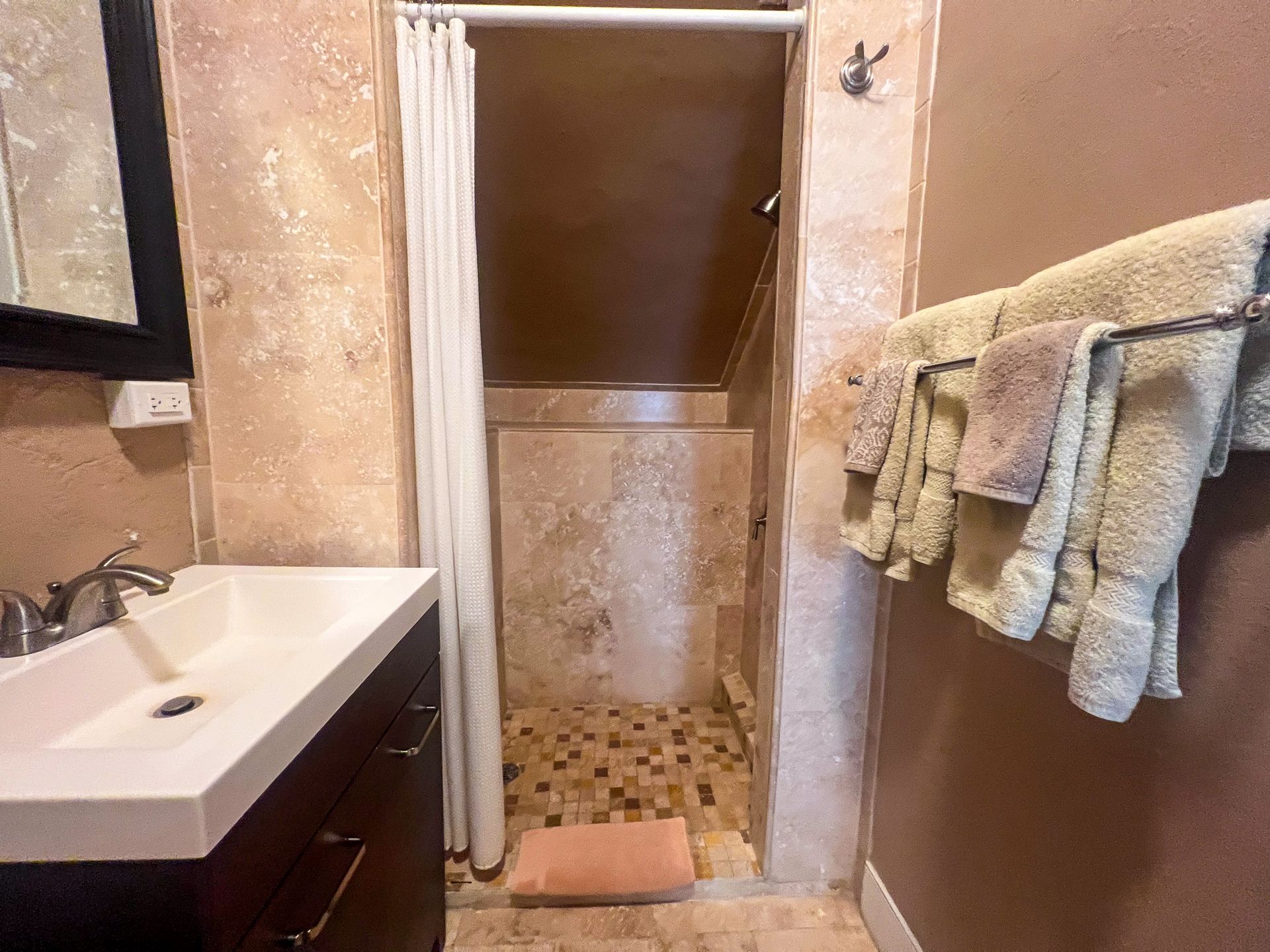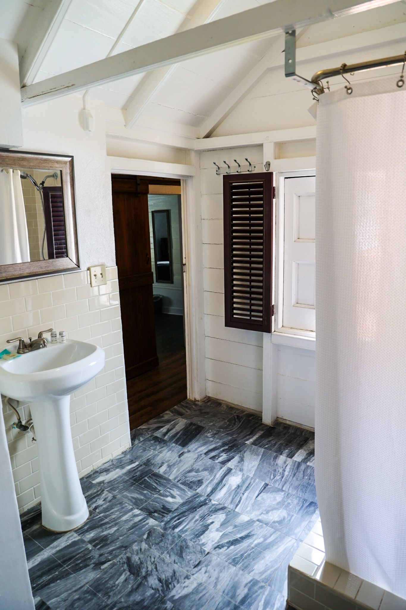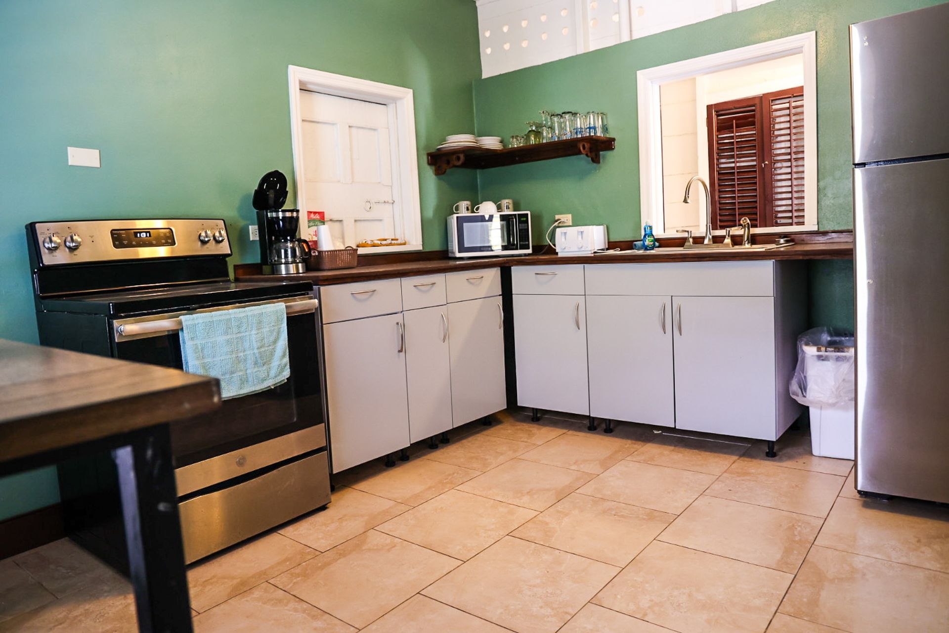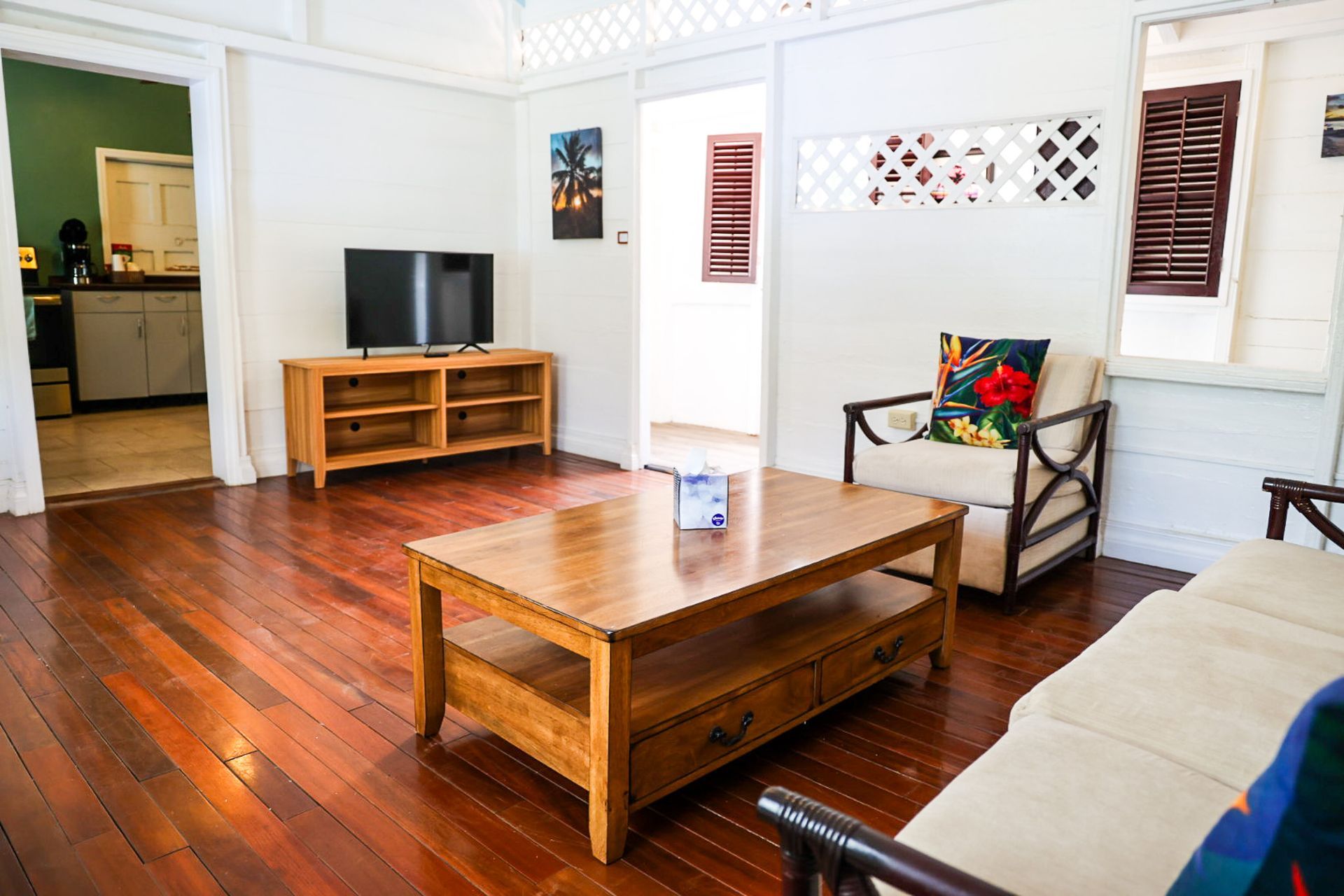 This two bedroom one bathroom suite is one of our largest. From the front door, imagine partial ocean views and great breezes cooling off your suite while taking in a beautiful sunset. This suite also boasts a full kitchen, with everything you will need to make a delicious meal for up to 4 people as well as a coffee maker for early risers. It also has a TV, WiFi, AC units in each bedroom, full sized couch, arm chair, ceiling fans, private bathroom with a walk-in shower, and traditional style dutch shutters. Steps away from our front gate, this is a very convenient option for anyone looking to stroll around town or have two couples enjoy a comfortable room in a prime location.