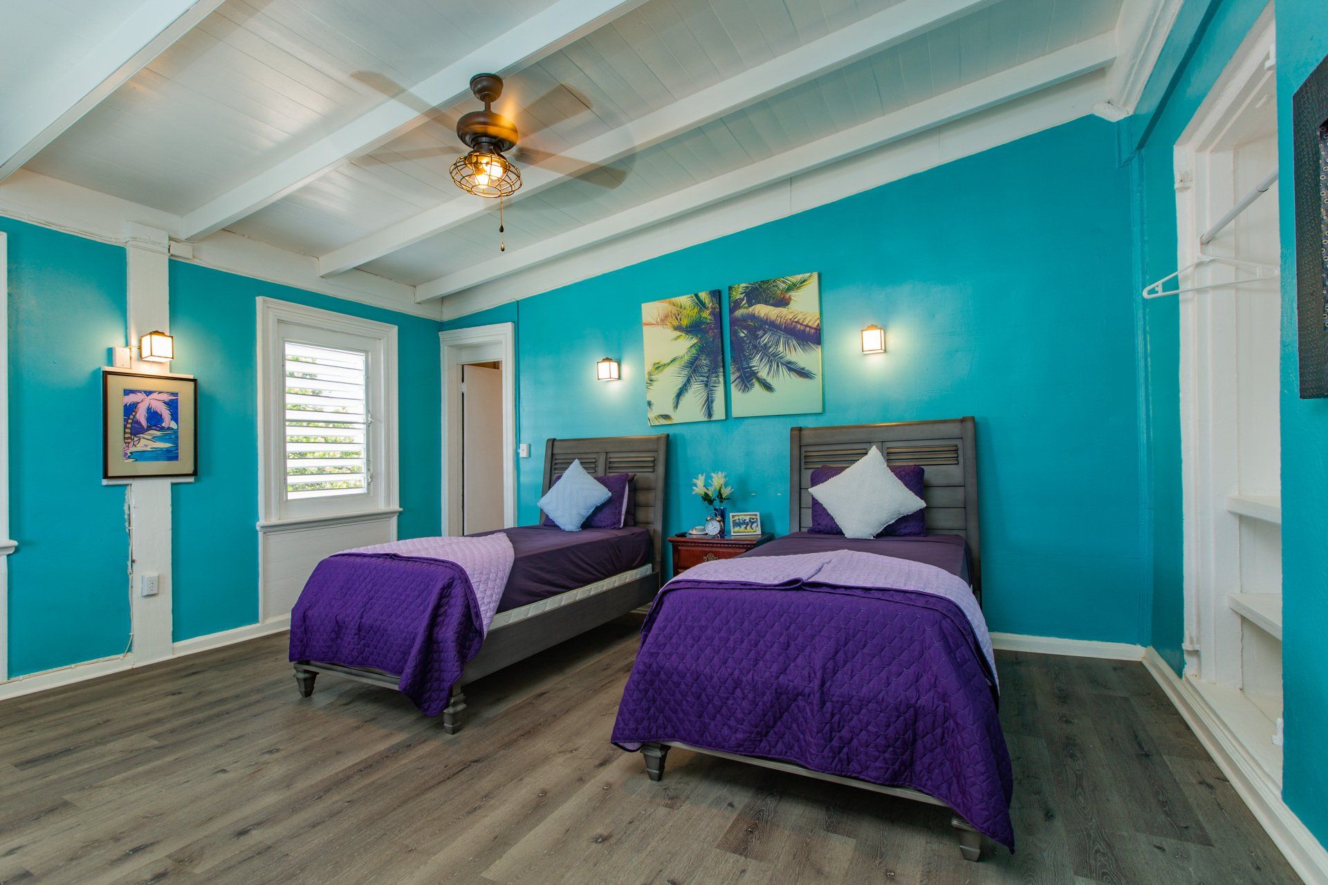 This top floor unit boasts the option of having either two twin beds or having them combined to make a king-sized bed. The first option makes it perfect for two single travelers to enjoy the same space without having to sacrifice a good night’s sleep. Or with the ability to combine with our Turtle Room, it offers the perfect combination for a small group or a family. With views of the Rainforest and Frederiksted Town, guests in the Palm Tree are the first to enjoy our Caribbean breezes and as well as the beauty of our sunrises. In room amenities include a microwave, minifridge, coffee maker AC, TV, Wi-Fi, Ceiling fan and a breezy bathroom with a walk-in shower.